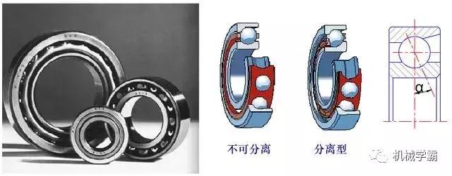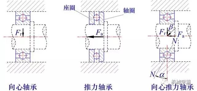 2 按可承受的外载荷分类:向心轴承、推力轴承、向心推力轴承。在选择滚动轴承时需要考虑受力方向。下图中:夹角α叫作轴承的接触角,夹角β叫作载荷角。