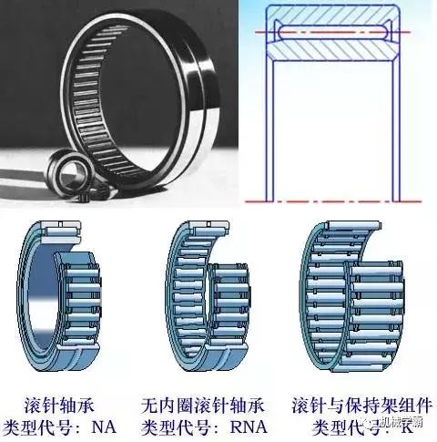 (7)滚针轴承类型代号为NA。内径相同时,滚针轴承比其他类型的轴承的外径小,适用于空间较小的场合。它的内圈或外圈可以分离,工作时允许内、外圈有少量的轴向错动,有较大的径向承载能力,一般不带保持架,摩擦系数较大。