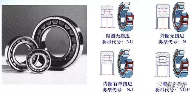 (2)圆柱滚子轴承圆柱滚子轴承的类型代号为N。它的外圈和内圈可以分离,无法承受轴向载荷,滚子由内圈(或外圈)的挡边进行轴向定位。有较大的径向承载能力。此类轴承可以不带外圈或内圈使用。