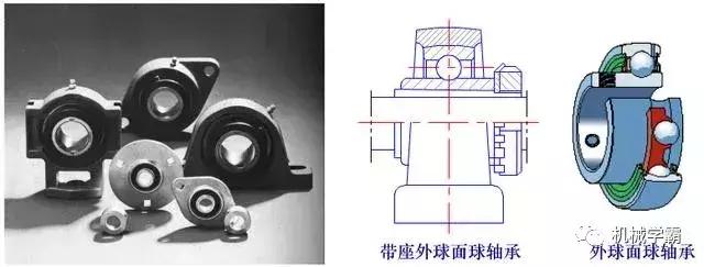 (8)带座外球面球轴承类型代号为u。带座外球面球轴承由两面带密封的外球面轴承和铸造的(或钢板冲压的)轴承座组成。这种轴承结构紧凑、装卸方便、密封完善,适用于简单支承,常用于采矿、冶金、农业、化工、纺织、印染、输送机械等行业。