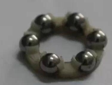 尼龙保持架上镶嵌着六颗钢珠