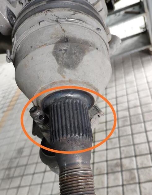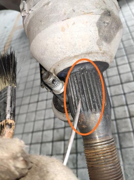 拆完之后,经过维修师傅们的轮番敲击后,终于还是被敲开了。敲都敲开了维修师傅索性就把羊角一起也给拆了下来,拆掉羊角之后可以清楚的看到上图的球笼万向节,上图圆圈内的齿槽中间已经几乎全部是铁锈,怪不得会啮合的那么牢。