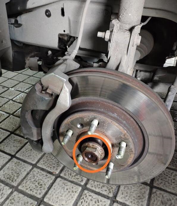 找到漏水的原因后,维修师傅开始处理地盘异响更换最前轮轴承。当维修师傅拆下轮胎看到半轴大螺母时心里就在想这个轴承绝非容易更换,因为从半轴球笼上面的锈就可以看得出已经好久好久没人拆过,很有可能球笼已经和轴承紧紧的啮合在一起,就算直接拆掉后面固定轴承的三颗露丝也未必能顺利取下轴承。所以师傅先用除锈剂处理大螺母周围的锈,然后拆掉上图圆圈内的大螺母,最后戴上几牙纹大螺母在从大螺母的位置用锤子使劲敲击。由于师傅怕使用的力气过大,造成内球笼与变速箱损坏,所以师傅决定拆掉羊角连接减震的固定螺丝给内球笼套留些较大的空间,然后在敲击。
