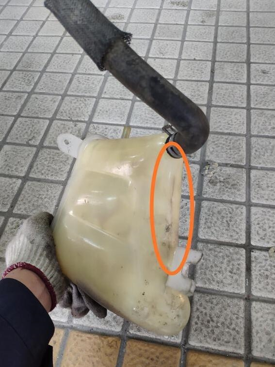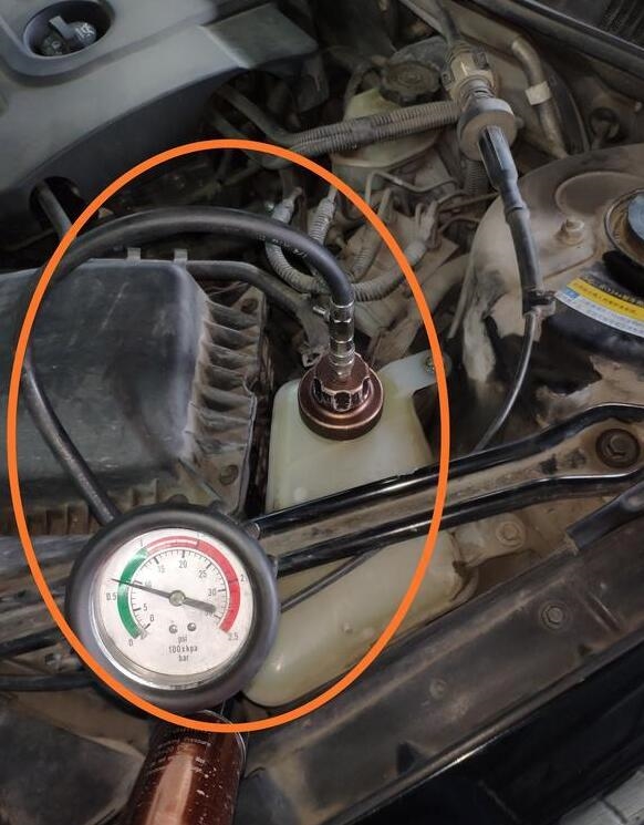 首先师傅先是检查处理漏水的问题,由于车主在其他修理厂没有检查出来问题,所以师傅这次检查不能再常规检查。这次师傅利用了高压测漏打气筒来把高压气体打入备水壶,利用高压来测试漏不漏水要比发动汽车查漏水更准确更容易。上图圆圈内为测漏工具,由于十分难找,所以师傅尽可能在不损坏水管和其他冷却零件的同时把气压打到很高。