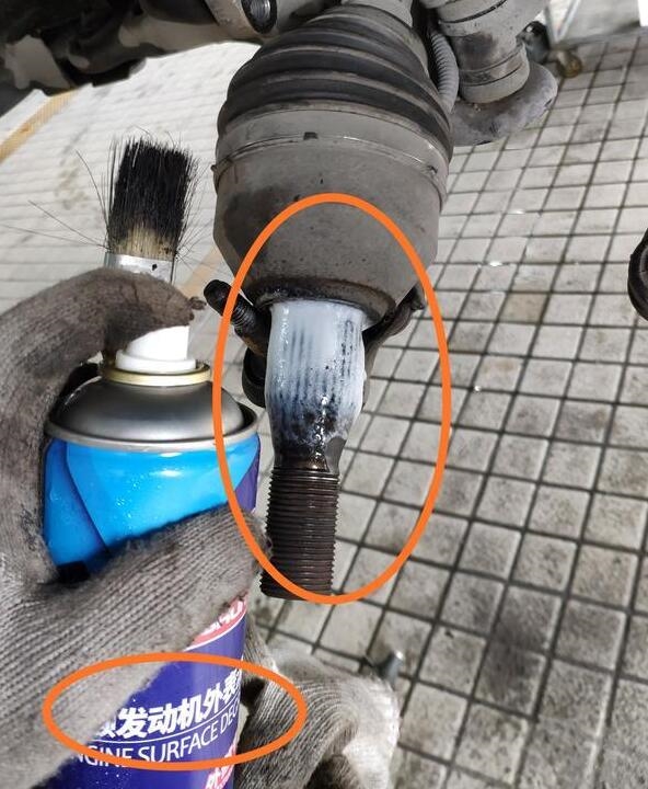 师傅猜测,生锈的原因可能是上次更换轴承时在齿槽上涂了黄油作为润滑,结果时间一久黄油逐渐变质最后和铁材料的球笼起了生锈的反应,所以维修师傅决定用发动机外部清洗剂把黄油清洗干净在装配新的轴承。