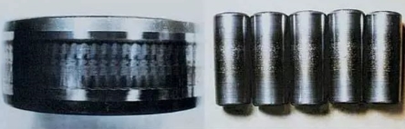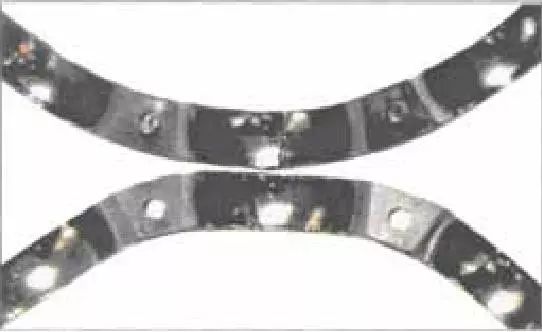 对称位置剥落表现在内圈为周围环带剥落,而外圈呈周向对称位置剥落(即椭圆的短轴方向),原因主要是因为外壳孔椭圆过大或两半分离式外壳孔结构,这在摩托车用凸轮轴轴承中表现尤为明显。当轴承压入椭圆偏大的外壳孔中或两半分离式外壳固紧时,轴承外圈产生椭圆,在短轴方向的游隙明显减少甚至负游隙。轴承在载荷的作用下,内圈旋转产生周向剥落痕迹,外圈只在短轴方向的对称位置产生剥落痕迹。这是该轴承早期失效的主要原因,经对该轴承失效件检验表明,该轴承外径圆度已从原工艺控制的0.8um变为27um。此值远远大于径向游隙值。因此,可以肯定该轴承是在严重变形及负游隙下工作的,工作面上易早期形成异常的急剧磨损与剥落。