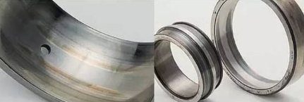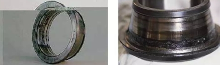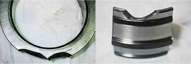 沟道单侧极限位置剥落主要表现在沟道与挡边交界处有严重的剥落环带。产生原因是轴承安装不到位或运转过程中突发轴向过载。