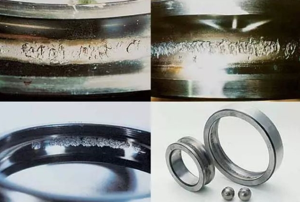滚动轴承的生锈和腐蚀会造成套圈、滚动体表面的坑状锈、梨皮状锈及滚动体间隔相同的坑状锈、全面生锈及腐蚀。最终引起滚动轴承的失效。