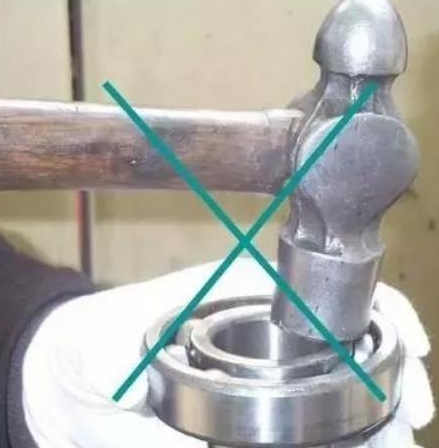 a.轴承套圈与轴或壳是过渡或过盈的小型轴承,直接用机械或液压方式,压入轴上或壳上,只要施力于过盈配合的轴承套圈上即可,注意不要用铁锤直接锤击,可以通过一个套筒再锤击套筒的方法,轻轻敲击套筒把轴承装到合适的位置。且敲击时应尽量均匀的作用在轴承套圈上,以防止轴承倾斜或歪斜。不能通过滚动体传递力,否则会在轴承工作表面造成压伤,轴承会很快损坏。