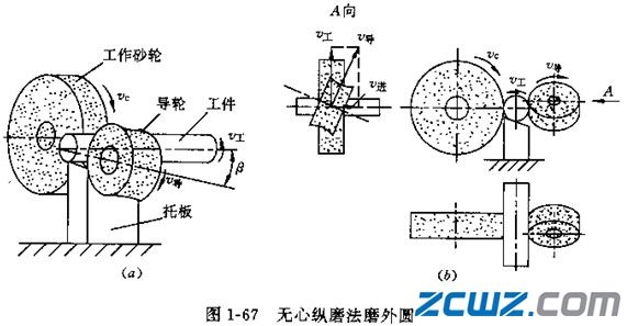大轮为工作砂轮,起切削作用。小轮为导轮,无切削能力。两轮与托板构成V形定位面托住工件。由于导轮的轴线与砂轮轴线倾斜β角( β=1°~6°),v导分解成v工和v进。 v工带动工件旋转, v进带动工件轴向移动。为使导轮与工件直线接触,把导轮圆周表面的母线修整成双曲线。无心纵磨法主要用于大批量生产中磨削细长光滑轴、销钉、小套等零件的外圆。