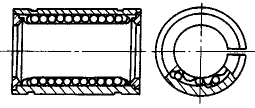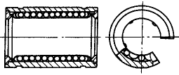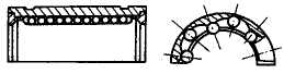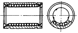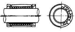 直线运动滚动支承的结构直线运动球轴承序号简 图名 称结构特点基本代号1 套筒型外套为一圆筒状,圆周均布三组以上钢球支承导轴,导轴上无沟槽,球在外套与导轴之间循环滚动作无限直线运动,可承受轻的径向载荷LB…2 调整游隙型将套筒型轴承轴向开一窄缝,利用轴承座调整轴承与导轴之间的径向游隙LB…AJ3 开口型将套简型轴承沿轴向切去一组钢球相对应的一个扇形面,可调整径向间隙LB…OP4 半型此轴承恰是套筒型轴承的一半,可径向安装。用于有中间支承的导轴上LB…HF5 镶滚道板调心型外套内镶有数条弧形滚道板承受载荷,滚道板沟道曲率半径与钢球的相似,故承载能力增加,滚道板可调心0.5°,作无限直线运动,可加工成开口型LB…BP6 径向循环型轴承的椭圆形循环滚道,占用径向空间,钢球数量多,承载能力较套筒型大,作无限直线运动LB…RA7 球花键型三点接触,接触角大,能传递扭矩,导轴为花键轴式,可预加载荷承受重载荷,可作为径向轴承使用,每条滚道有一组循环球,直线运动行程无限LB…BS8 往复旋转型可同时作直线往复及旋转运动,钢球非循环运动,行程有限,精度高,摩擦系数低,可承受中等载荷LB…ST9 球和保持架组件无外套的往复旋转型轴承,精度高,刚性好,常用于冲压模具导向轴,直线往复运动行程有限,球不能作循环运动,承受中等载荷LB…BC