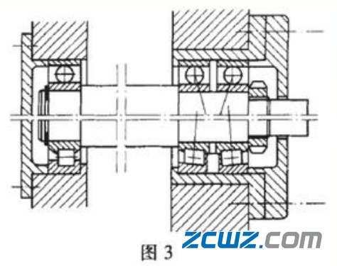 (1)当轴向力较小时,可采用图3上半部所示球轴承(或游动端用内外可分离型的短圆柱滚子轴承,如图3下半部所示)支承,此时游动端轴承不受轴向力,双向固定端可承受双向轴向力。