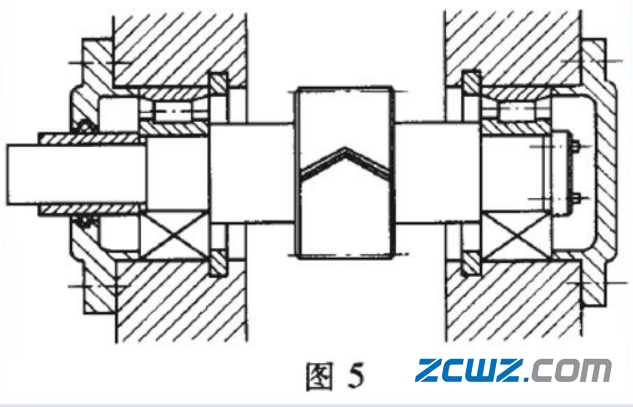 要求左右双向游动的轴,可采用两端游动的轴系结构,如一对人字齿轮轴。由于其本身的轴向限位作用,它们的轴承内外圈和轴向固定应设计成只保证其中一根轴相对机座有固定的轴向位置,而另一根轴上的两个轴承都必须是游动的,以防止齿卡死或人字齿的两侧受力不均匀,如图5所示。此时两端轴承都不受轴向力。
