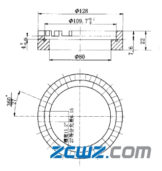 利用装滚子辅具来装第一列滚子, 辅具设计原理是:4 mm为内圈挡边高度,这样辅具的高度内圈挡边高度一致后才能装人第一列滚子,在辅具上铣27等分槽,槽的高度为挡住滚子不倒为准,此辅具给出的挡滚子高度为7.6 mm,槽宽尺寸应大于滚子直径尺寸,利用图8的辅具装人第一列滚子,然后装入第一列保持架,这样完成了第一列滚子的装人过程,如图9所示。第二列保持架放在第一列保持架之上,装入第二列滚子,这样完成了内圈与两列滚子的全部装配过程,如图10所示。